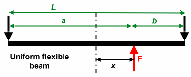 Let us find the deflection of a uniform flexible beam, loaded with a force F at a distance x from the center. We want the deflection at x, which is where the ball impact would be if it were a clubface. We use the well-known formula