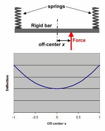 Let us find the deflection at x of a rigid bar suspended at the ends by two springs of spring constant K. In this case, the deflection is not the bending of the beam, but rather the motion of the beam restrained by the springs.