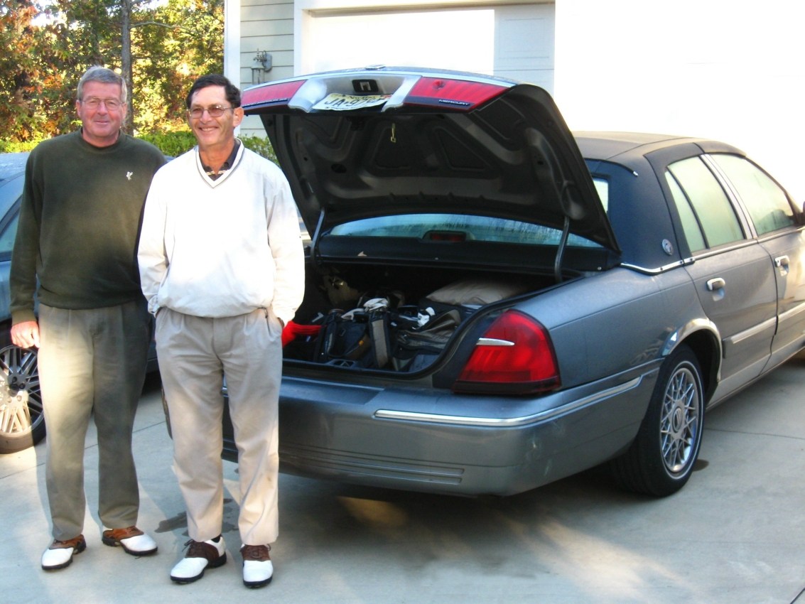 Bob Hurley's big ol' land yacht was by far the biggest car among the four of us. It was big enough to hold all four of us and all four sets of clubs, golf shoes, and other paraphernalia. So we used it for all our transport for the week -- all of us able to go in one car. (And, by the end of the week, Bob could drive us back to the house without getting lost.) | ![]() There was enough trunk for four golf bags with room to spare |