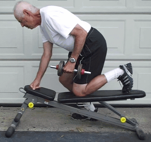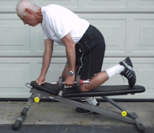 Kneeling on a weight bench, tuck your elbow at your side and lift the