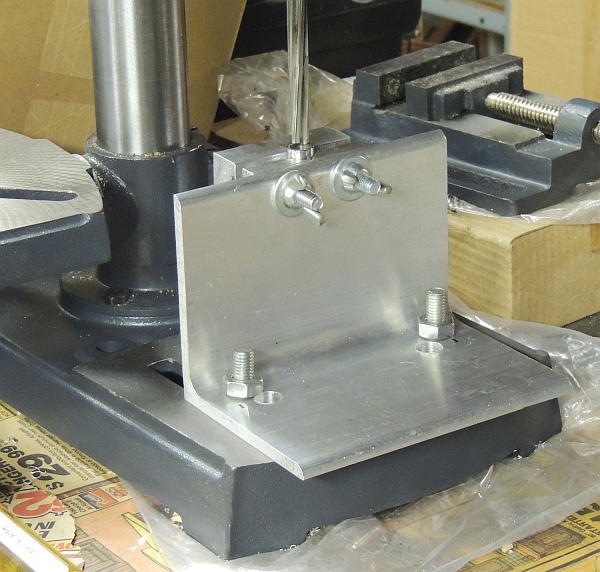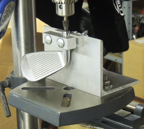 might damage the clubhead. | Mounting the fixture on the drill pressNow let's see about those holes in the horizontal leg of the base. They are for bolting the fixture to the drill press.