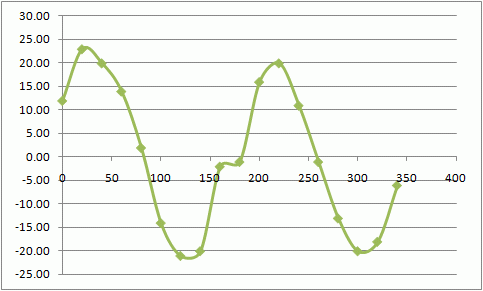 in the graph at the right, were roughly sinusoidal, but only one cycle of the sine wave through the full shaft rotation.