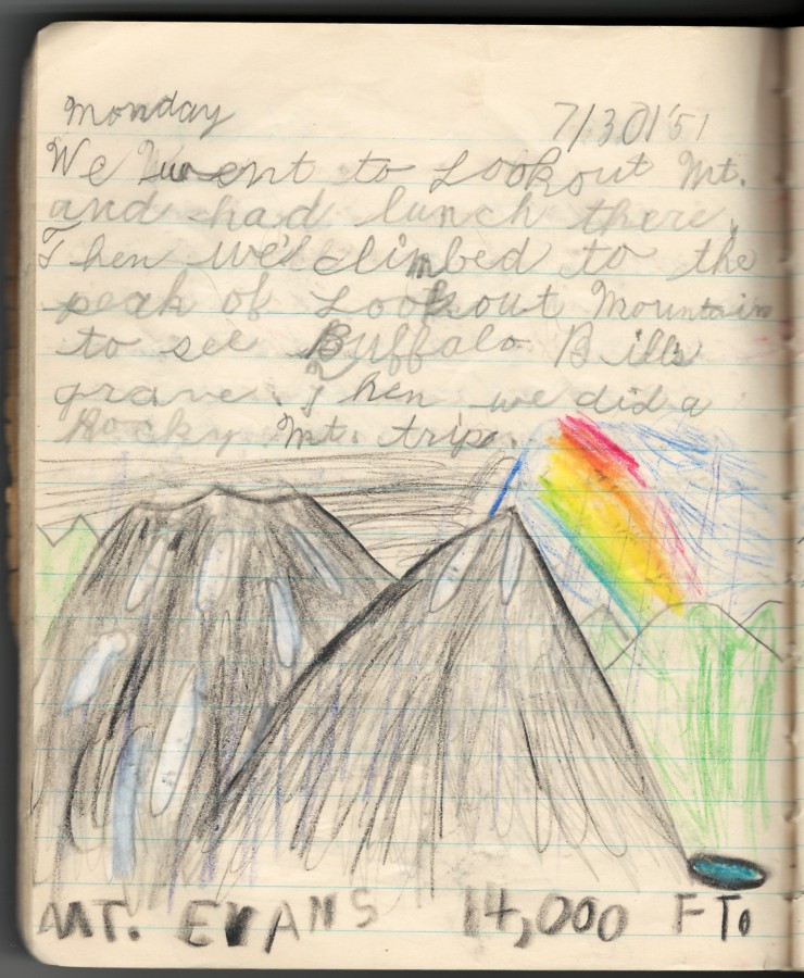 Lookout Mountain and the foothills The text says "Rocky Mt. trip", but I doubt we got very far into the Rockies that day. From my drawing, we apparently got close enough to see Mt Evans. (Of course, Evans is really big; you can see it from very far away.) ![]()