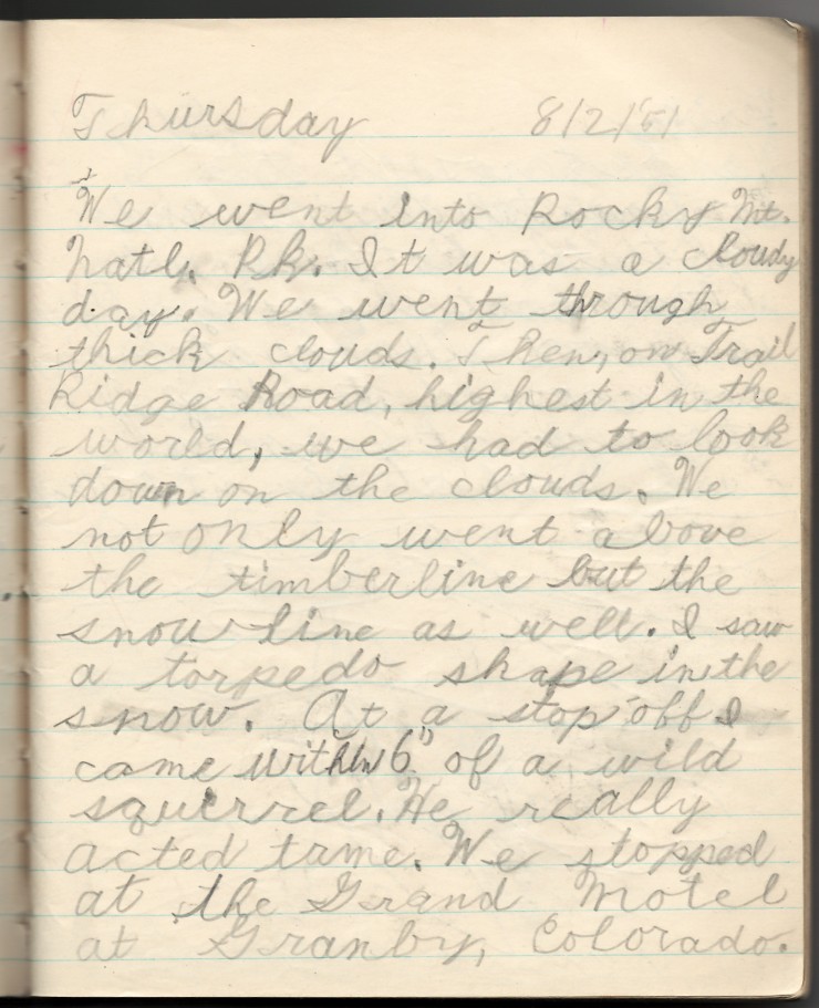 Rocky Mountain National Park We left Denver and drove through Rocky Mountain National Park on Trail Ridge Road. ![]() There is a picture on the next page labeled 8/2/'51. It must depict Rocky Mountain National Park, and I used the next page because there was no more room on this one.