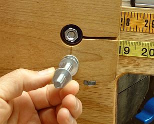 in place. You have now determined the location of the toggle board.The other T-nut should be just tight enough so the bolt tip does not wobble, but not so tight that the bolt cannot slide in the slot. That is because the clearance between the hole in the toggle board and the T-nut "bushing" is quite snug; it is tighter than the tolerance on the spacing between the holes. That means that there is no fixed position for the bolt that will work for both the upper and lower pair of holes. (If you have drilled the holes so accurately that it works for you, then you can tighten both T-nuts.) Hold the sliding bolt's T-nut in position with some sort of thread-locking compound. (Actually I used a bit of contact cement for the purpose. Worked fine, but it took over a day to set up properly.) |