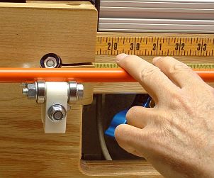 Mark this position on the beam using a marker or pencil through the middle of the unused pair of holes.Release the cam clamps, and carefully slide the beam to the right until the "wand" is clear of the rotator board. While you do this, use your hand as a "clamp" to hold the toggle board in the same position relative to the beam. Carefully lift the toggle board off the bolts, being sure not to move the bolts in the beam slot. Actually, it is no disaster if the bolts move a little in the slot. Remember, you marked their position on the beam. Compare the bolts' position with the marks you made on the beam and, if necessary, slide the bolts in the slot so they line up with the marks. |