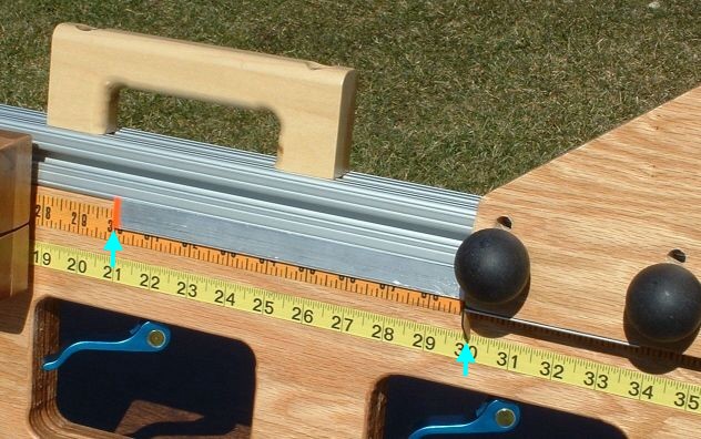 Place the toggle board in the upper (profiling) position. Set the beam length for 19".Find a fairly long (46" or so) wood shaft, that is as straight as possible. Any residual bend will jeopardize the accuracy of the results. As you go through the process, you will be able to judge how straight the shaft is. You may choose to switch shafts in the middle, to find a straighter one. That's OK; you will not have wasted much time doing the early work with a less-straight shaft. With the toggle clamp wide open and the tip stop out of the way, slide the shaft into the bearings from rear to front. Slide it in until the butt is within an inch or so of the rear bearings. There will be a lot of tip sticking out in front of the front bearings. The shaft should sit in the bearings of its own weight, since there is so much tip hanging out the front. Sight along the shaft from the front. It should look something like the photo. Ideally, the shaft will be centered between the bearings of the front bearing assembly. The alignment in the photo is pretty good, but the shaft is slightly to the right of center. |