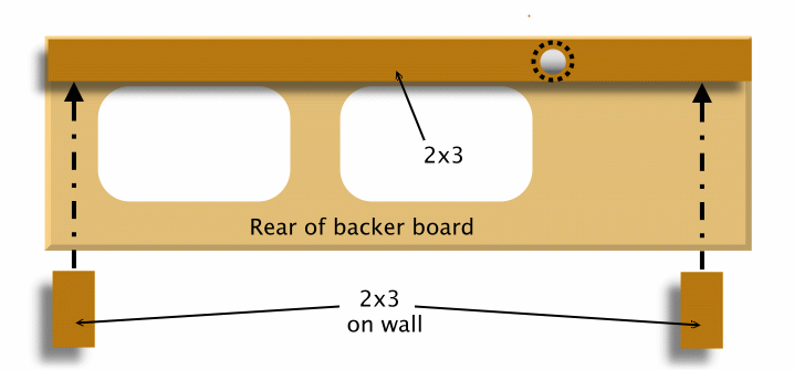what it looks like. Also, a few considerations:(1) Locating the NF4 properly on the wall should be your primary consideration. Pay special attention to the placement of the wall-mounted blocks. Some things to watch for: The meeting of the wall-mounted and backer-board 2x3 blocks cannot be a simple flat surface. There must be some "locking device" to prevent the backer-board from slipping away from the wall. Below are a couple of ideas for locking the 2x3 blocks together. |