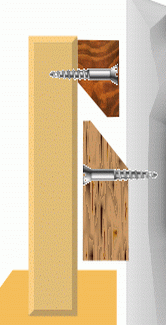 ![]() (3) Here's a variation on the wedge approach, suggested by Ed Reeder. It has flat instead of angled planes, so it doesn't try to pry the screws out of the wall. Instead of using 2x3 lumber, use leftover plywood from making the backer board and toggle board. |