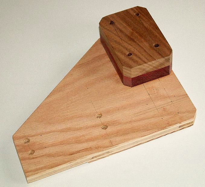 bolt, holding the toggle clamp lightly in place. Using any measurement equipment you feel will be constructive, align the toggle clamp so its action is perfectly perpendicular to the bottom edge of the toggle board. If you aligned the support blocks really well when you glued them on, they will be a very good guide. Just align the toggle clamp's edges parallel to those of the support block. When the toggle clamp is perfectly aligned, tighten down the nut to hold it in place. Check to make sure it is still perfectly aligned. |