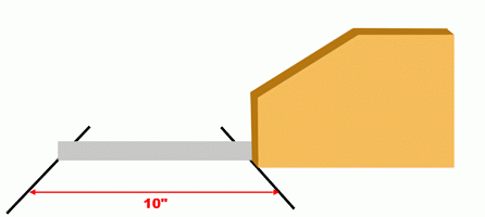 hardboard on the tabletop) rule two parallel lines exactly 10" apart.Apply contact cement to the aluminum strip where it meets the slot on the back of the toggle board, and to the slot as well. When it is tacky, place both pieces on edge on the tabletop, with the tip of the aluminum on one line and the tip of the toggle board on the other line. (See diagram) Bring the tacky surfaces together in this position. That way, the bottom of the toggle board and the bottom of the aluminum strip will be in exactly the same plane, and the extended wand will be exactly 10" long. Secure the aluminum to the backer board with the flat-head wood screws. |