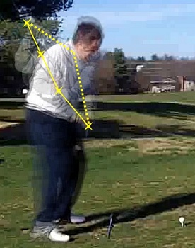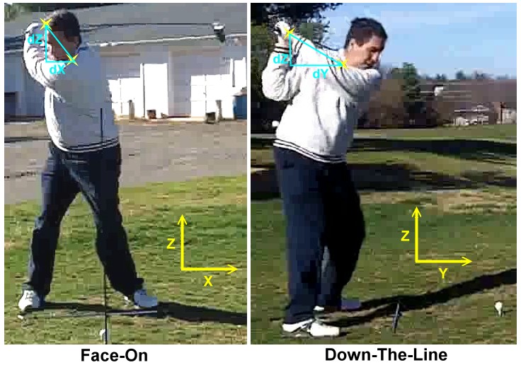 ![]() The strategy I used is exemplified in this pair of frames. I paired face-on frames with down-the-line frames at the same position in the swing. Then I measured the distances in the X, Y, and Z directions, from the pivot at the base of the neck to the point where the hands joined on the grip. These distances are labeled dX, dY, and dZ in the frames. The actual distance r can be computed by the Pythagorean Theorem extended to three dimensions: r2